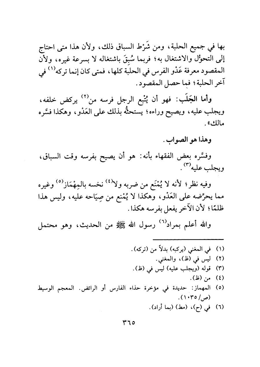 بها في جميع الحلبة، ومن شَرْط السباق ذلك، ولأن هذا متى احتاج إلى التحوُّل والاشتغال به؛ فربما سُبِقَ باشتغاله لا بسرعة غيره، ولأن المقصود معرفة عَدْو الفرس في الحلبة كلها، فمتى كان إنما تركه (¬١) في آخر الحلبة؛ فما حصل المقصود.