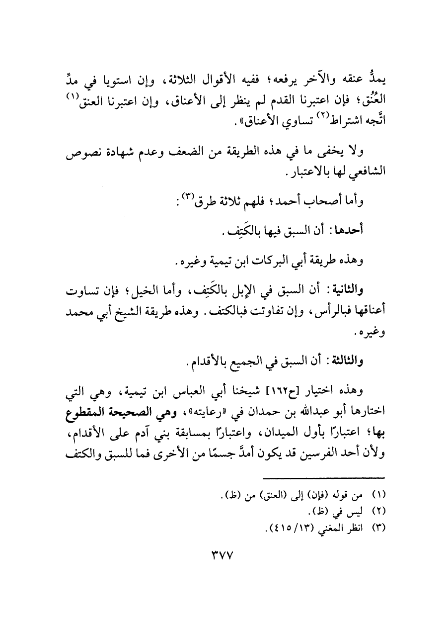 وهذه اختيار [ح ١٦٢] شيخنا أبي العباس ابن تيمية، وهي التي اختارها أبو عبد الله بن حمدان في "رعايته"، وهي الصحيحة المقطوع بها؛ اعتبارًا بأول الميدان، واعتبارًا بمسابقة بني آدم على الأقدام، ولأن أحد الفرسين قد يكون أمدَّ جسمًا من الأخرى فما للسبق والكتف