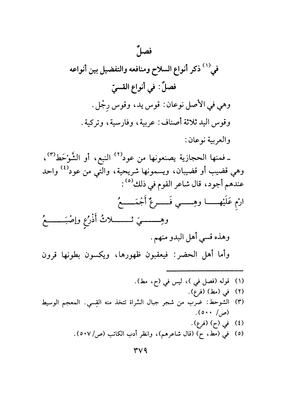 - فمنها الحجازية يصنعونها من عود (¬٢) النبع، أو الشَّوْحَط (¬٣)، وهي قضيب أو قضيبان، ويسمونها شريحية، والتي من عود (¬٤) واحد عندهم أجود، قال شاعر القوم في ذلك (¬٥):