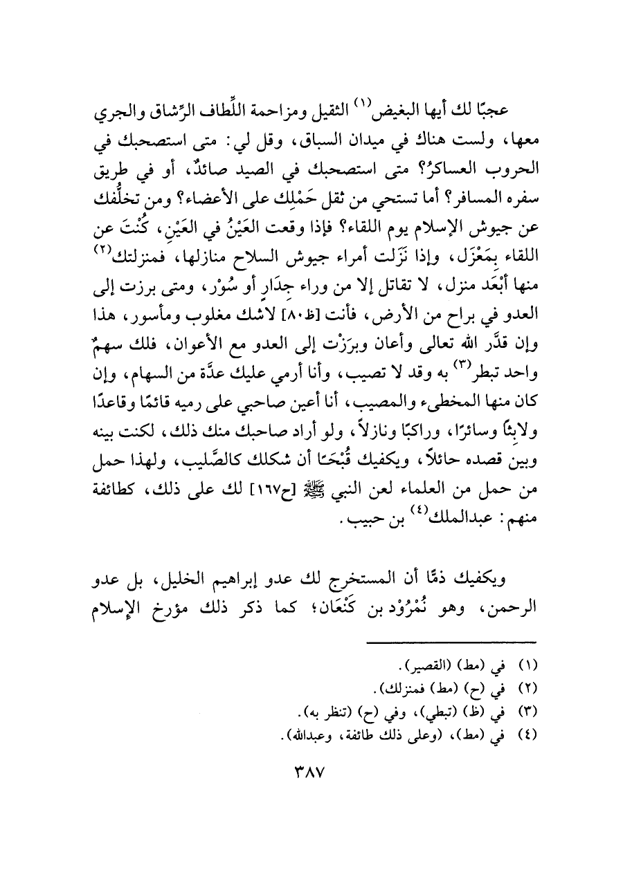 عجبًا لك أيها البغيض (¬١) الثقيل ومزاحمة اللِّطاف الرِّشاق والجري معها، ولست هناك في ميدان السباق، وقل لي: متى استصحبك في الحروب العساكرُ؟ متى استصحبك في الصيد صائدٌ، أو في طريق سفره المسافر؟ أما تستحي من ثقل حَمْلِك على الأعضاء؟ ومن تخلُّفك عن جيوش الإسلام يوم اللقاء؟ فإذا وقعت العَيْنُ في العَيْنِ، كُنْتَ عن اللقاء بمَعْزَل، وإذا نَزَلت أمراء جيوش السلاح منازلها، فمنزلتك (¬٢) منها أبْعَد منزل، لا تقاتل إلا من وراء جِدَارٍ أو سُوْر، ومتى برزت إلى العدو في براح من الأرض، فأنت [ظ ٨٠] لا شك مغلوب ومأسور، هذا وإن قدَّر الله تعالى وأعان وبرَزْت إلى العدو مع الأعوان، فلك سهمٌ واحد تبطر (¬٣) به وقد لا تصيب، وأنا أرمي عليك عدَّة من السهام، وإن كان منها المخطئ والمصيب، أنا أعين صاحبي على رميه قائمًا وقاعدًا ولابِثًا وسائرًا، وراكبًا ونازلًا، ولو أراد صاحبك منك ذلك، لكنت بينه وبين قصده حائلًا، ويكفيك قُبْحًا أن شكلك كالصَّليب، ولهذا حمل من حمل من العلماء لعن النبي - صلى الله عليه وسلم - [ح ١٦٧] لك على ذلك، كطائفة منهم: عبد الملك (¬٤) بن حبيب.