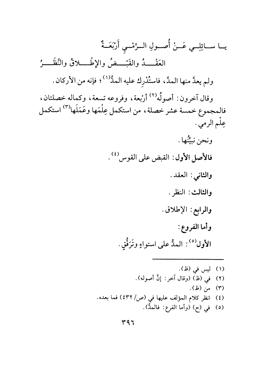 يا سائِلِي عَنْ أُصولِ الرَّمْيِ أَرْبَعَةٌ ... العَقْدُ والقَبْضُ والإِطْلاقُ والنَّظَرُ