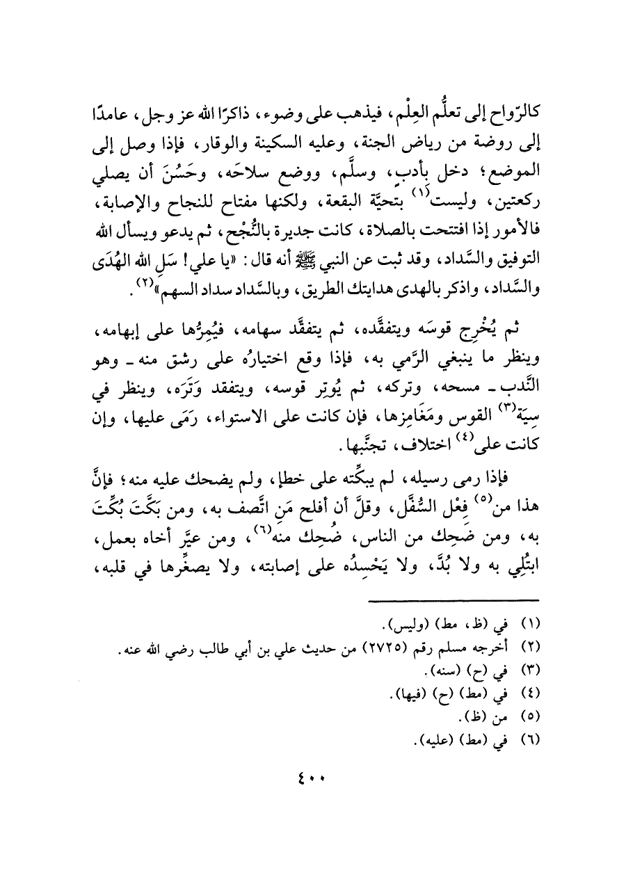 كالرّواح إلى تعلُّم العِلْم، فيذهب على وضوء، ذاكرًا الله عز وجل، عامدًا إلى روضة من رياض الجنة، وعليه السكينة والوقار، فإذا وصل إلى الموضع؛ دخل بأدبٍ، وسلَّم، ووضع سلاحَه، وحَسُنَ أن يصلي ركعتين، وليست (¬١) بتحيَّة البقعة، ولكنها مفتاح للنجاح والإصابة، فالأمور إذا افتتحت بالصلاة، كانت جديرة بالنُّجْح، ثم يدعو ويسأل الله التوفيق والسَّداد، وقد ثبت عن النبي - صلى الله عليه وسلم - أنه قال: "يا علي! سَلِ الله الهُدَى والسَّداد، واذكر بالهدى هدايتك الطريق، وبالسَّداد سداد السهم" (¬٢).