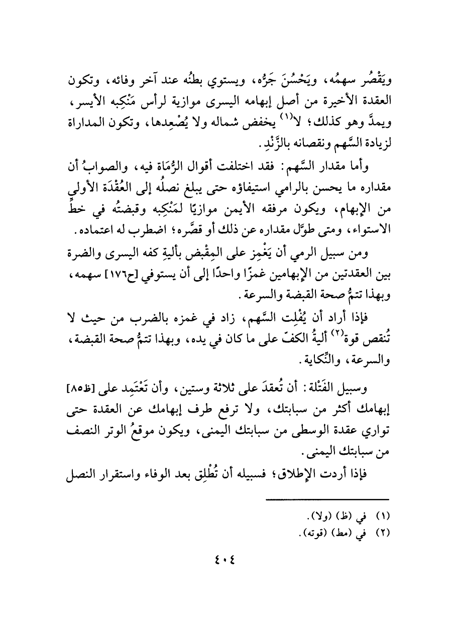 فإذا أراد أن يُفْلِت السَّهم، زاد في غمزه بالضرب من حيث لا تُنقص قوة (¬٢) أليةُ الكفّ على ما كان في يده، وبهذا تتمُّ صحة القبضة، والسرعة، والنِّكاية.