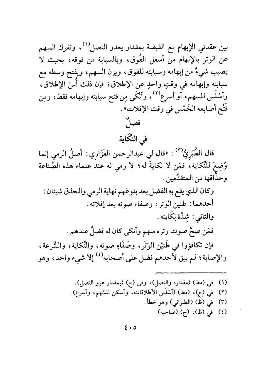 فإن تكافؤوا في طَنيْن الوَتَر، وصَفَاءِ صوته، والنِّكاية، والسُّرعة، والإِصابة؛ لم يبق لأحدهم فضل على أصحابه (¬٤) إلا شيء واحد، وهو