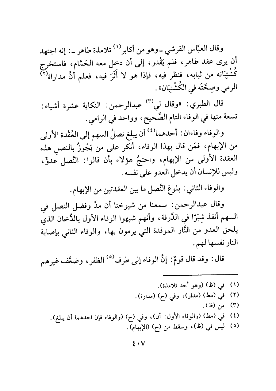 والوفاء وفاءان: أحدهما (¬٤) أن يبلغ نصلُ السهم إلى العُقْدة الأولى من الإبهام، فمَن قال بهذا الوفاء، أنكر على من يَجُوزُ بالنصلِ هذه العقدة الأولى من الإبهام، واحتجَّ هؤلاء بأن قالوا: النَّصل عدوٌّ، وليس للإنسان أن يدخل العدو على نفسه.