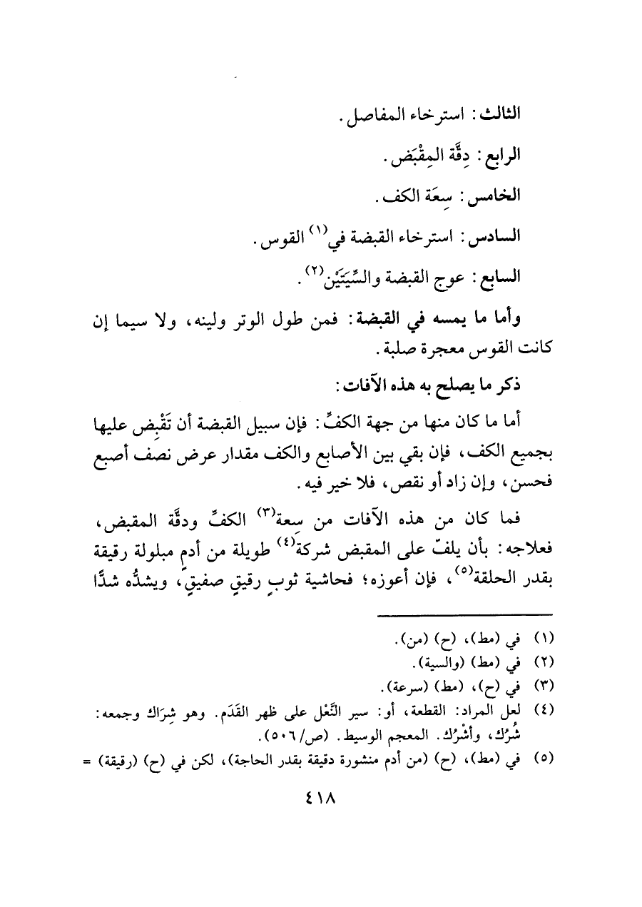 فما كان من هذه الآفات من سِعة (¬٣) الكفِّ ودقَّة المقبض، فعلاجه: بأن يلفّ على المقبض شركة (¬٤) طويلة من أدمٍ مبلولة رقيقة بقدر الحلقة (¬٥)، فإن أعوزه؛ فحاشية ثوبٍ رقيقٍ صفيقٍ، ويشدُّه شدًّا
