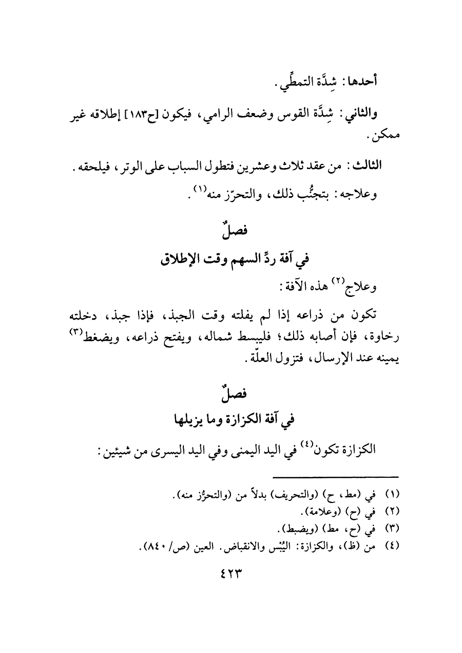 والثاني: شِدَّة القوس وضعف الرامي، فيكون [ح ١٨٣] إطلاقه غير ممكن.