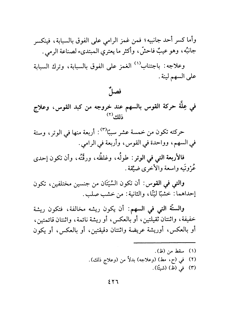فصلٌ في عِلَّة حركة القوس بالسهم عند خروجه من كبد القوس، وعلاج ذلك (¬٢)