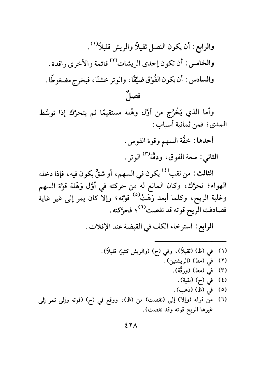 الثالث: من نقب (¬٤) يكون في السهم، أو شقٍّ يكون فيه، فإذا دخله الهواء؛ تحرَّك، وكان المانع له من حركته في أوَّل وَهْلة قوَّة السهم وغلبة الريح، وكلما أبعد وَهَتْ (¬٥) قوَّته؛ وإلا كان يمر إلى غير غاية فصادفت الريح قوته قد نقصت (¬٦)؛ فحرَّكته.