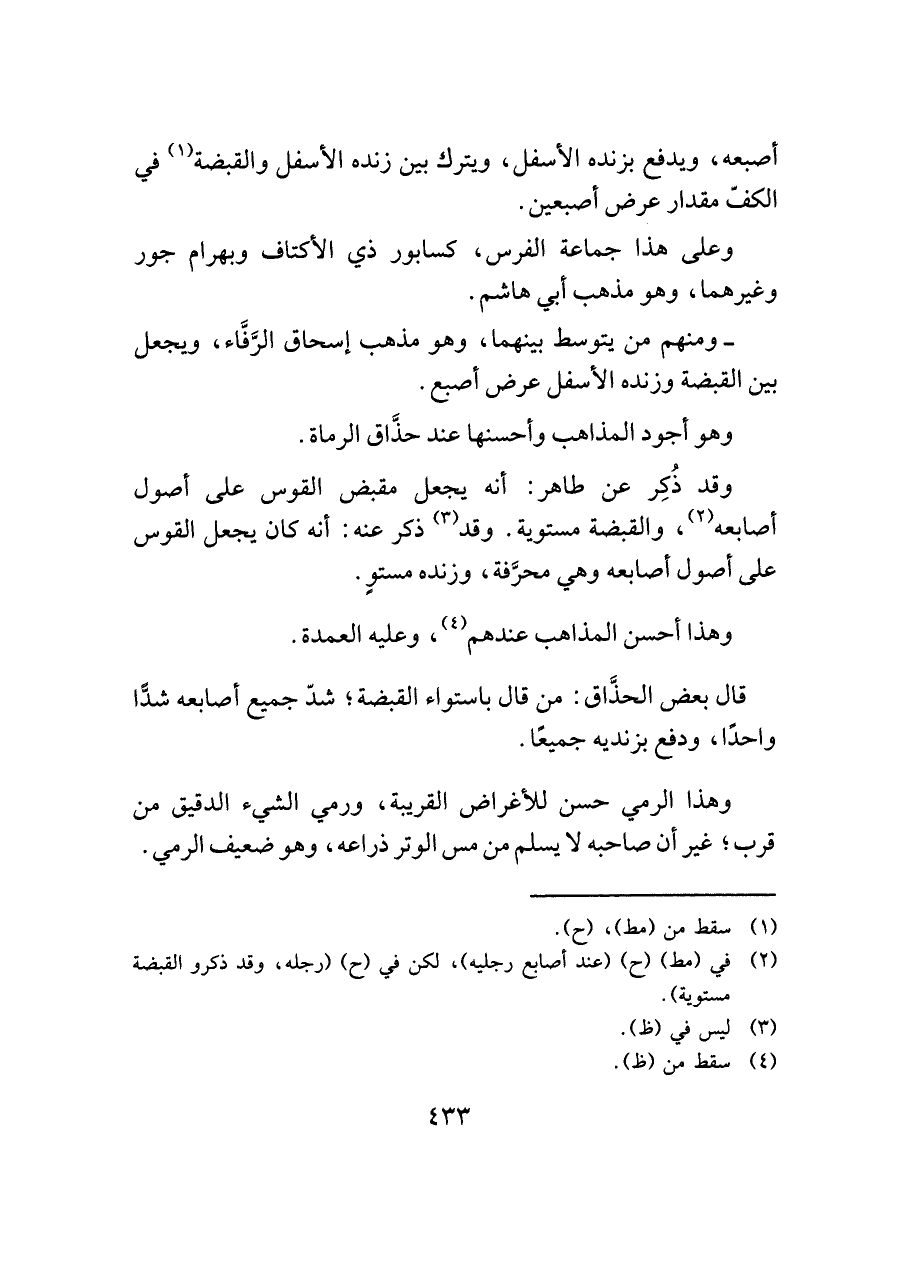 وقد ذُكِر عن طاهر: أنه يجعل مقبض القوس على أصول أصابعه (¬٢)، والقبضة مستوية. وقد (¬٣) ذكر عنه: أنه كان يجعل القوس على أصول أصابعه وهي محرَّفة، وزنده مستوٍ.