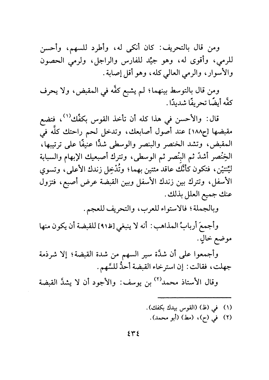 قال: والأحسن في هذا كله أن تأخذ القوس بكفِّك (¬١)، فتضع مقبضها [ح ١٨٨] عند أصول أصابعك، وتدخل لحم راحتك كلَّه في المقبض، وتشد الخنصر والبنصر والوسطى شدًّا عنيفًا على ترتيبها، الخِنْصر أشدّ ثم البِنْصر ثم الوسطى، وتترك أصبعيك الإبهام والسبابة ليِّنتيْن، فتكون كأنَّكَ عاقد مئتين بهما؛ وتُدْخِل زندك الأعلى، وتسوي الأسفل، وتترك بين زندك الأسفل وبين القبضة عرض أصبع، فتزول عنك جميع العلل بذلك.