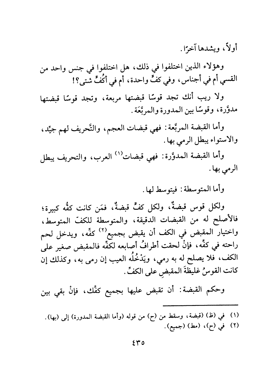 ولا ريب أنك تجد قوسًا قبضتها مربعة، وتجد قوسًا قبضتها مدوَّرة، وقوسًا بين المدورة والمربَّعَة.