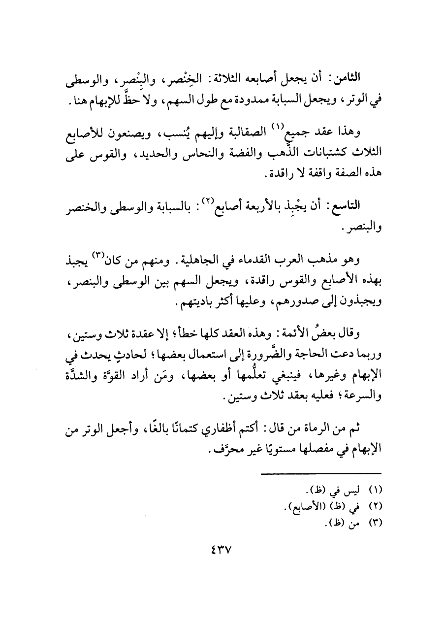 ثم من الرماة من قال: أكتم أظفاري كتمانًا بالغًا، وأجعل الوتر من الإبهام في مفصلها مستويًا غير محرَّف.