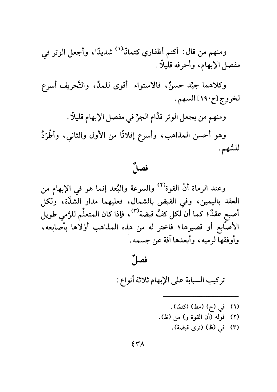 وعند الرماة أنّ القوة (¬٢) والسرعة والبُعد إنما هو في الإبهام من العقد باليمين، وفي القبض بالشمال، فعليهما مدار الشدَّة، ولكل أصبعٍ عقدٌ؛ كما أن لكل كفٍّ قبضة (¬٣)، فإذا كان المتعلِّم للرَّمي طويل الأصابع أو قصيرها؛ فاختر له من هذه المذاهب أوْلاها بأصابعه، وأوفقها لرميه، وأبعدها آفة عن جسمه.