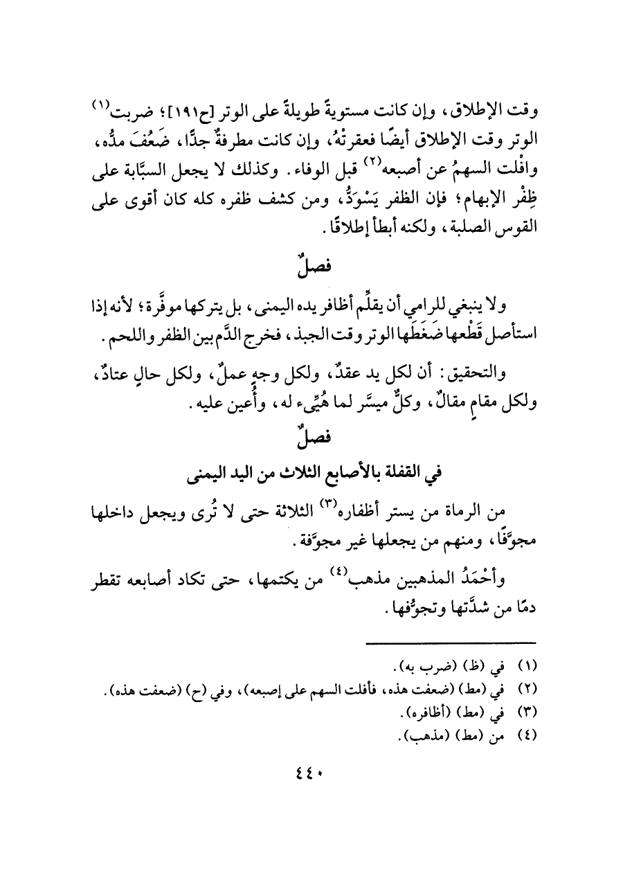 وقت الإطلاق، وإن كانت مستويةً طويلةً على الوتر [ح ١٩١]؛ ضربت (¬١) الوتر وقت الإطلاق أيضًا فعقرتْهُ، وإن كانت مطرفةٌ جدًّا، ضَعُفَ مدُّه، وافْلت السهمُ عن أصبعه (¬٢) قبل الوفاء. وكذلك لا يجعل السبَّابة على ظِفْر الإبهام؛ فإن الظفر يَسْوَدُّ، ومن كشف ظفره كله كان أقوى على القوس الصلبة، ولكنه أبطأ إطلاقًا.
