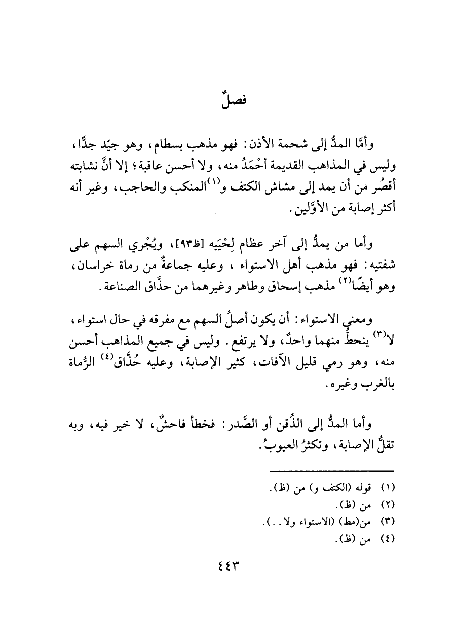 وأما من يمدُّ إلى آخر عظام لِحْيَيه [ظ ٩٣]، ويُجْري السهم على شفتيه: فهو مذهب أهل الاستواء، وعليه جماعةٌ من رماة خراسان، وهو أيضًا (¬٢) مذهب إسحاق وطاهر وغيرهما من حذَّاق الصناعة.