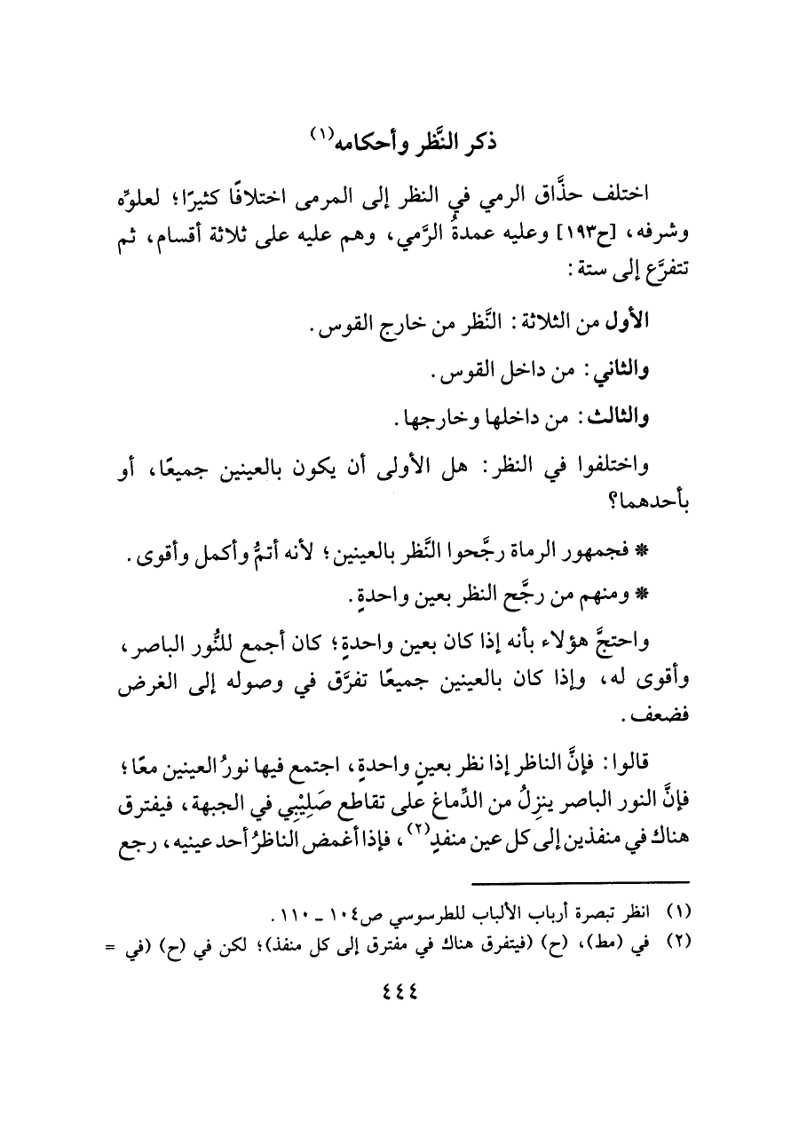 اختلف حذَّاق الرمي فى النظر إلى المرمى اختلافًا كثيرًا؛ لعلوِّه وشرفه، [ح ١٩٣] وعليه عمدةُ الرَّمي، وهم عليه على ثلاثة أقسام، ثم تتفرَّع إلى ستة:
