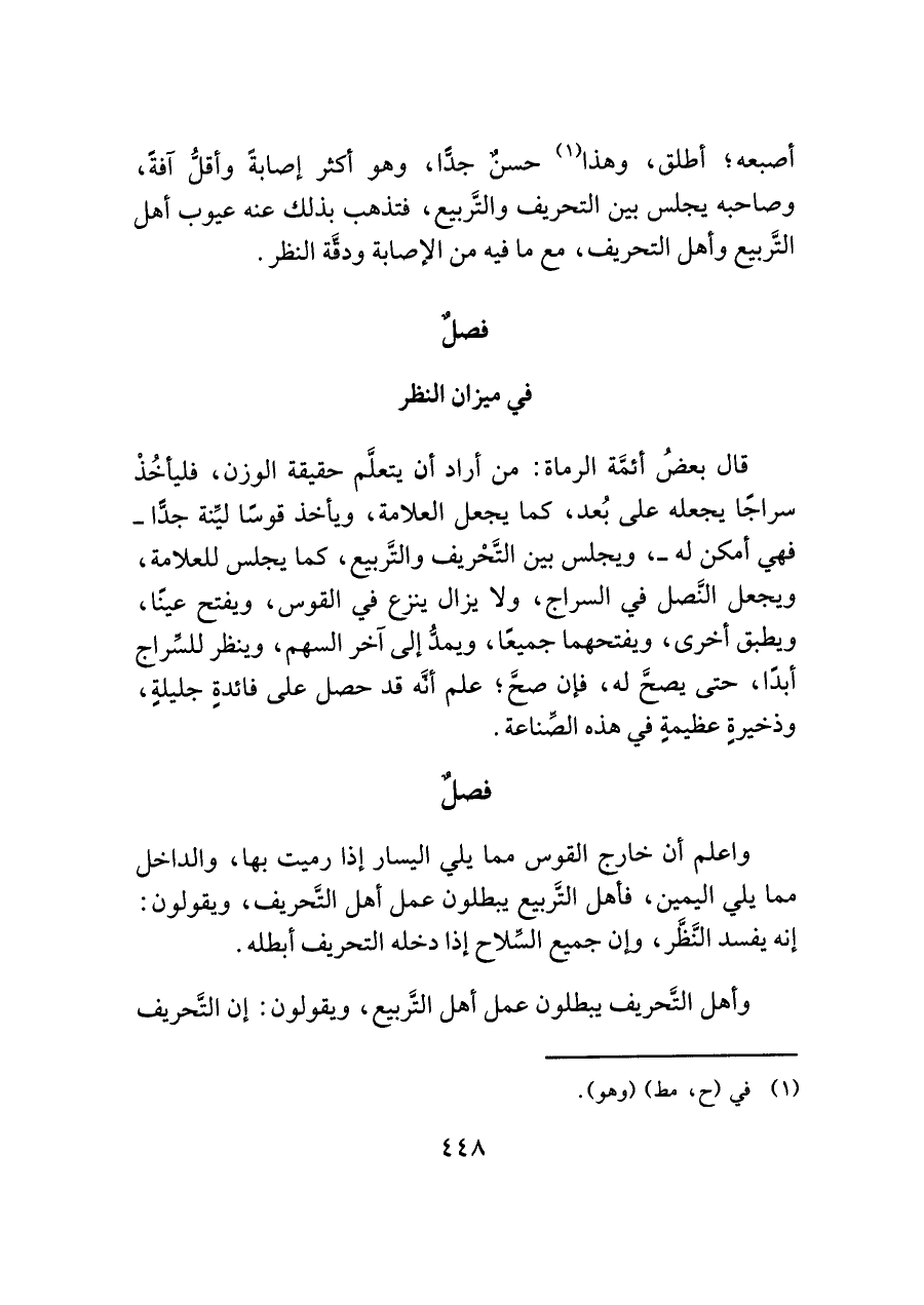 أصبعه؛ أطلق، وهذا (¬١) حسنٌ جدًّا، وهو أكثر إصابةً وأقلُّ آفةً، وصاحبه يجلس بين التحريف والتّربيع، فتذهب بذلك عنه عيوب أهل التَّربيع وأهل التحريف، مع ما فيه من الإصابة ودقَّة النظر.
