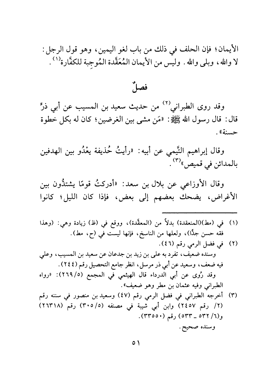 (¬٣) أخرجه الطبراني في فضل الرمي رقم (٤٧) وسعيد بن منصور في سننه رقم (٢/ رقم ٢٤٥٧) وابن أبي شيبة في مصنفه (٥/ ٣٠٥) رقم (٢٦٣١٨) و (٦/ ٥٣٢ - ٥٣٣) رقم (٣٣٥٥٠).