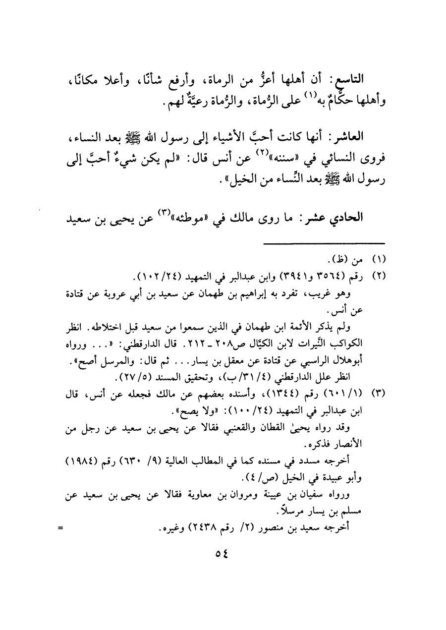 العاشر: أنها كانت أحبَّ الأشياء إلى رسول الله - صلى الله عليه وسلم - بعد النساء، فروى النسائي في "سننه" (¬٢) عن أنس قال: "لم يكن شيءٌ أحبَّ إلى رسول الله - صلى الله عليه وسلم - بعد النِّساء من الخيل".