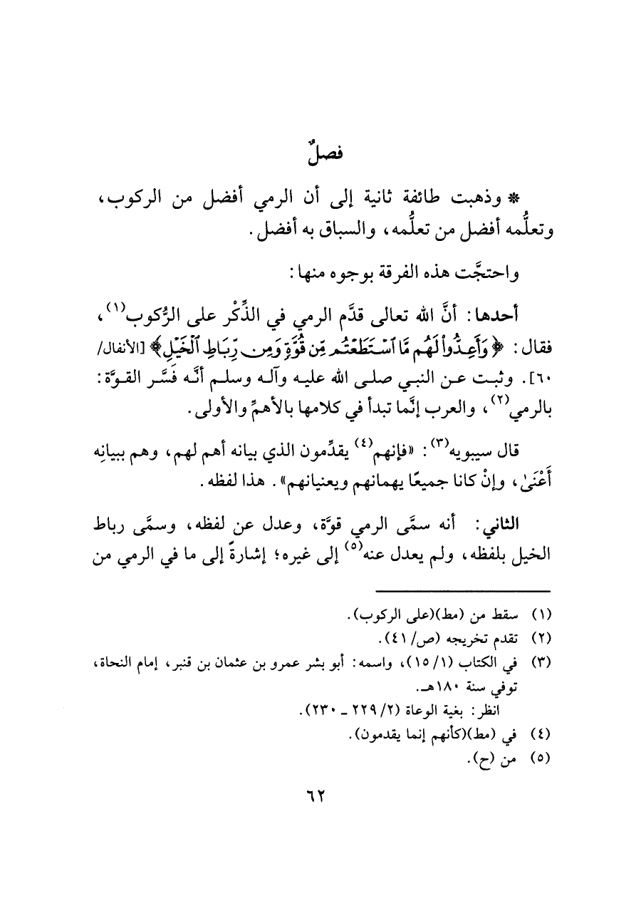 * وذهبت طائفة ثانية إلى أن الرمي أفضل من الركوب، وتعلُّمه أفضل من تعلُّمه، والسباق به أفضل.