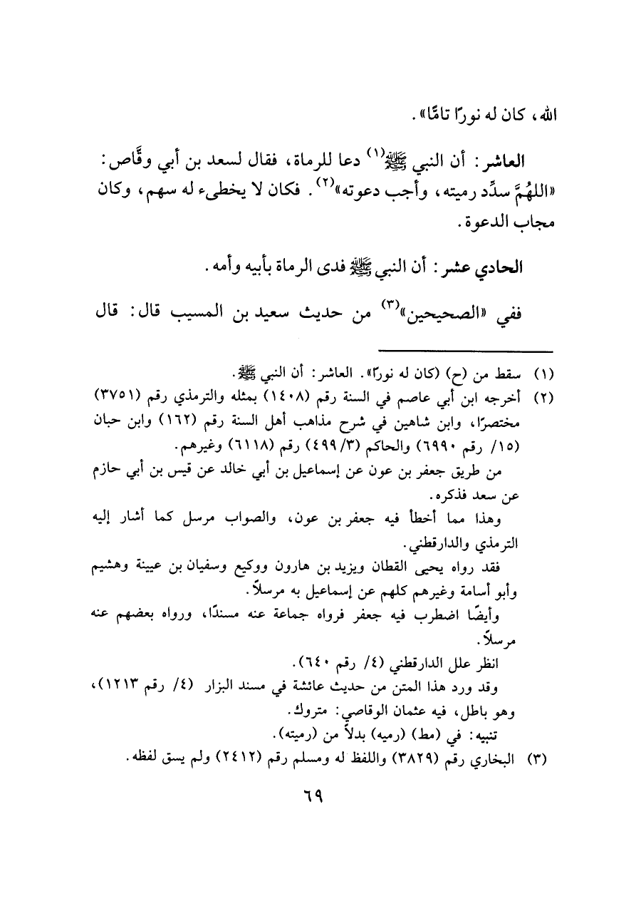 العاشر: أن النبي - صلى الله عليه وسلم - (¬١) دعا للرماة، فقال لسعد بن أبي وقَّاص: "اللهُمَّ سدِّد رميته، وأجب دعوته" (¬٢). فكان لا يخطئ له سهم، وكان مجاب الدعوة.