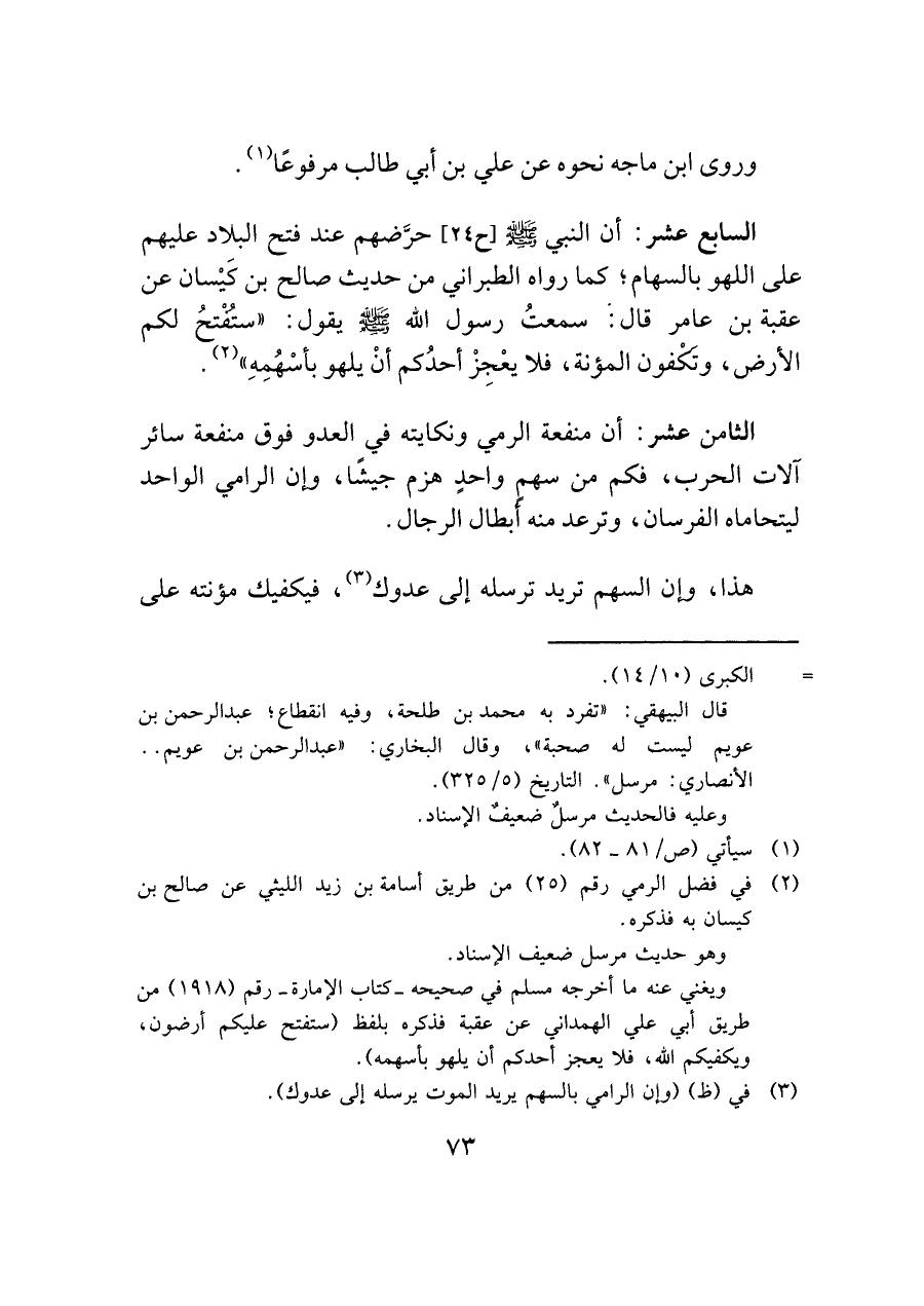 السابع عشر: أن النبي - صلى الله عليه وسلم - [ح ٢٤] حرَّضهم عند فتح البلاد عليهم على اللهو بالسهام؛ كما رواه الطبراني من حديث صالح بن كَيْسان عن عقبة بن عامر قال: سمعتُ رسول الله - صلى الله عليه وسلم - يقول: "ستُفْتحُ لكم الأرض، وتَكْفون المؤنة، فلا يعْجِزْ أحدُكم أنْ يلهو بأسْهُمِهِ" (¬٢).