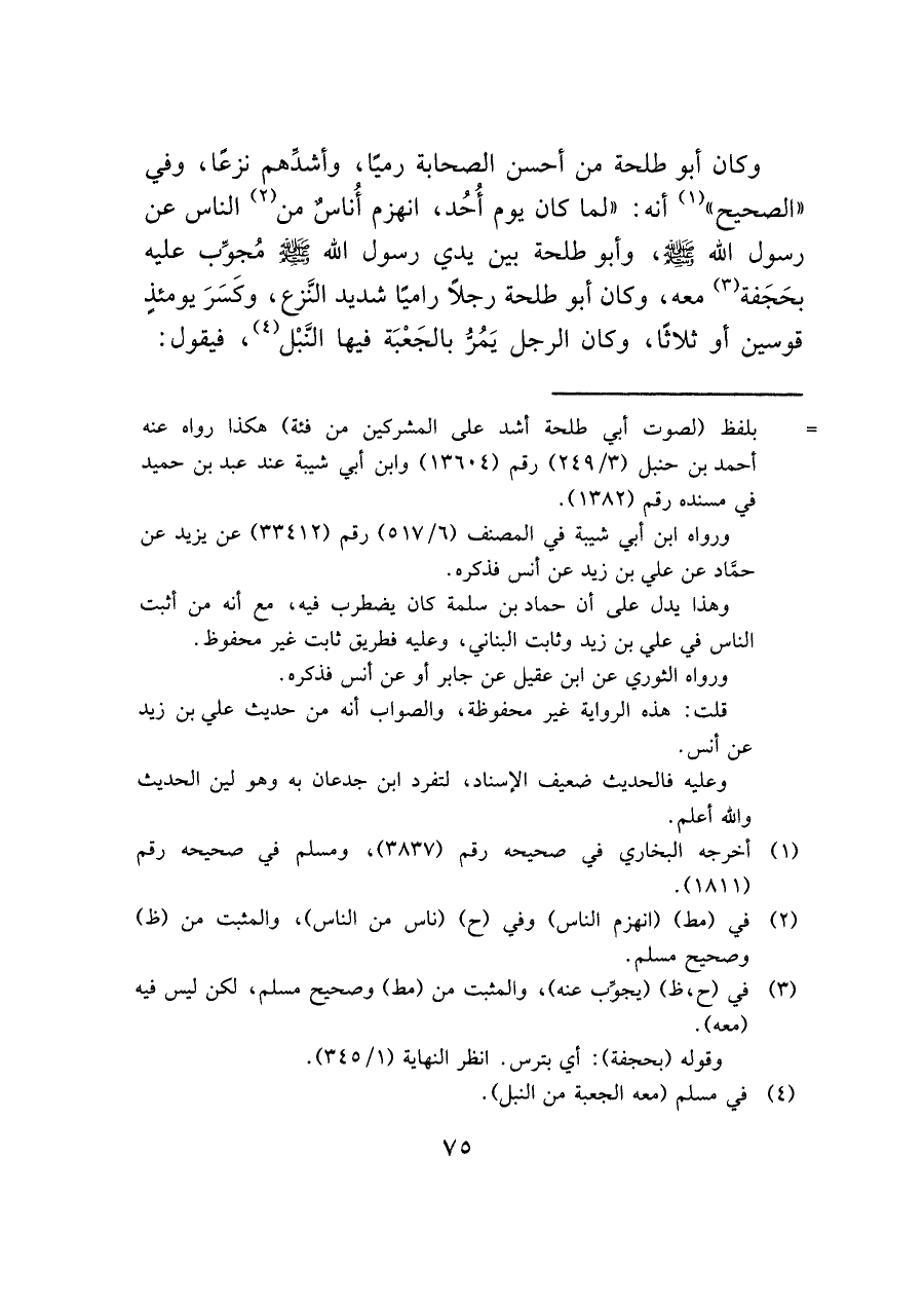 وكان أبو طلحة من أحسن الصحابة رميًا، وأشدِّهم نزعًا، وفي "الصحيح" (¬١) أنه: "لما كان يوم أُحُد، انهزم أُناسٌ من (¬٢) الناس عن رسول الله - صلى الله عليه وسلم -، وأبو طلحة بين يدي رسول الله - صلى الله عليه وسلم - مُجوِّب عليه بحَجَفة (¬٣) معه، وكان أبو طلحة رجلًا راميًا شديد النَّزع، وكَسَرَ يومئذٍ قوسين أو ثلاثًا، وكان الرجل يَمُرُّ بالجَعْبَة فيها النَّبْل (¬٤)، فيقول: