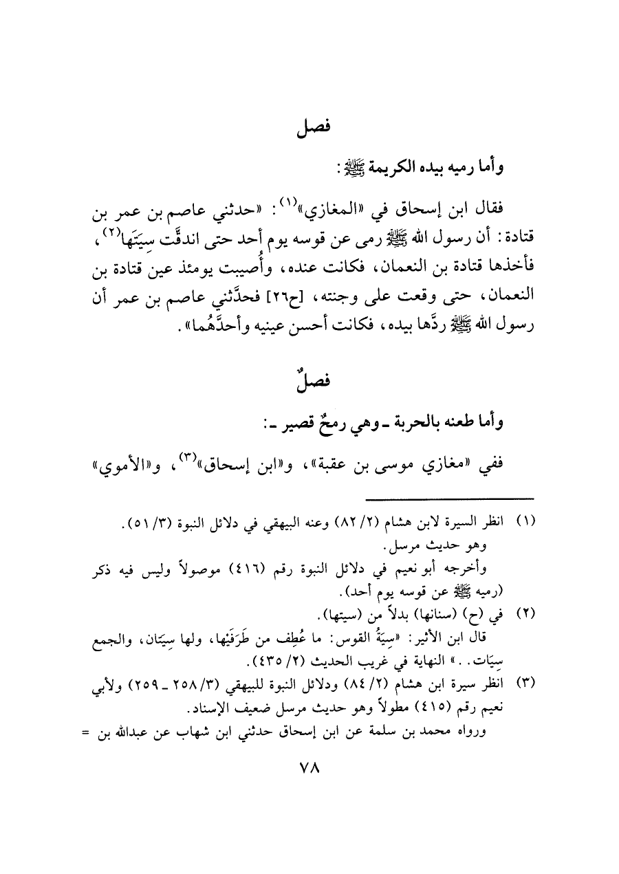 فقال ابن إسحاق في "المغازي" (¬١): "حدثني عاصم بن عمر بن قتادة: أن رسول الله - صلى الله عليه وسلم - رمى عن قوسه يوم أحد حتى اندقَّت سِيَتَها (¬٢)، فأخذها قتادة بن النعمان، فكانت عنده، وأُصيبت يومئذ عين قتادة بن النعمان، حتى وقعت على وجنته، [ح ٢٦] فحدَّثني عاصم بن عمر أن رسول الله - صلى الله عليه وسلم - ردَّها بيده، فكانت أحسن عينيه وأحدَّهُما".
