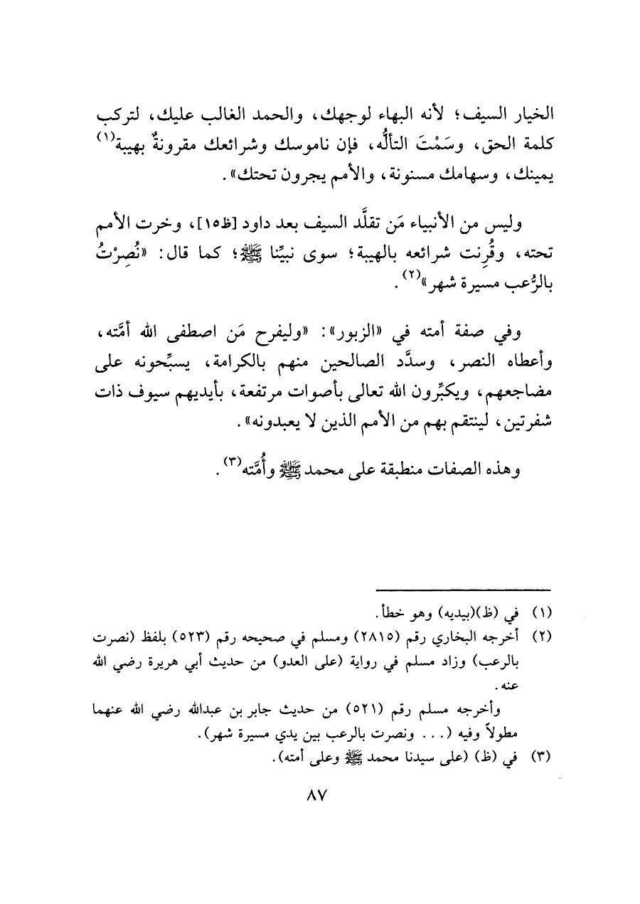 وليس من الأنبياء مَن تقلَّد السيف بعد داود [ظ ١٥]، وخرت الأمم تحته، وقُرِنت شرائعه بالهيبة؛ سوى نبيِّنا - صلى الله عليه وسلم -؛ كما قال: "نُصِرْتُ بالرُّعب مسيرة شهر" (¬٢).