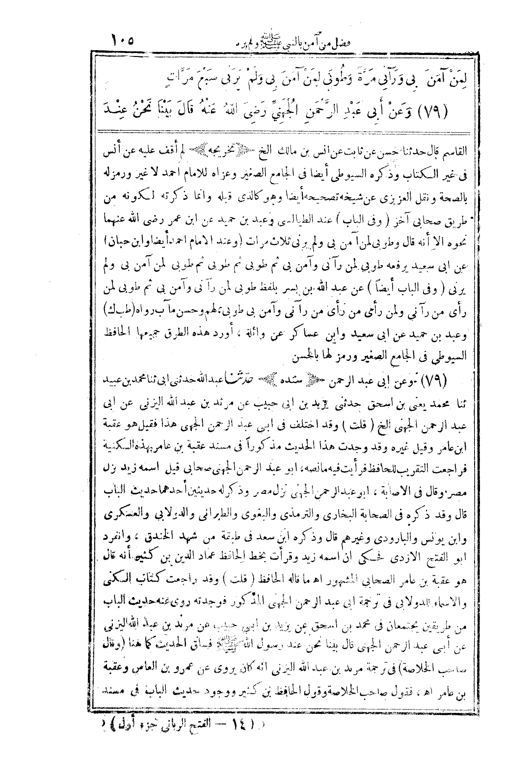 (79) وعن أبي عبد الرحمن {سنده} حدثنا عبد الله حدثني أبي ثنا محمد بن عبيد ثنا محمد يعني بن إسحاق حدثني يزيد بن أبي حبيب عن مرثد بن عبد الله اليزني عن أبي عبد الرحمن الجهني الخ (قلت) وقد اختلف في أبي عبد الرحمن الجهني هذا فقيل هو عقبة بن عامر وقيل غيره وقد وجدت هذا الحديث مذكورا في مسند عقبة بن عامر بهذه الكنية فراجعت التقريب للحافظ فرأيت فيه ما نصه، أبو عبد الرحمن الجهني صحابي قيل اسمه زيد نزل مصر، وقال في الإصابة: أبو عبد الرحمن الجهني نزل مصر وذكر له حديثين أحدهما حديث الباب قال وقد ذكره في الصحابة البخاري والترمذي والبغوي والطبراني والدولابي والعسكري وابن يونس والبارودي وغيرهم قال وذكره ابن سعد في طبقة من شهد الخندق وانفرد أبو الفتح الأزدي فحكى أن اسمه زيد وقرأت بخط الحافظ عماد الدين بن كثير أنه قال هو عقبة بن عامر الصحابي المشهور اهـ ما قاله الحافظ (قلت) وقد راجعت كتاب الأسماء والكنى للدولابي في ترجمة أبي عبد الرحمن الجهني المذكور فوجدته روى عنه حديث الباب من طريقين يجتمعان في محمد بن إسحاق عن يزيد بن أبي حبيب عن مرثد بن عبد الله اليزني عن أبي عبد الرحمن الجهني قال بينا نحن عند رسول الله صلى الله عليه وسلم فساق الحديث كما هنا (وقال صاحب الخلاصة) في ترجمة مرثد بن عبد الله اليزني أنه كان يروي عن عمرو بن العاص وعقبة بن عامر اهـ، فقول صاحب الخلاصة وقول الحافظ بن كثير ووجود حديث الباب في مسند