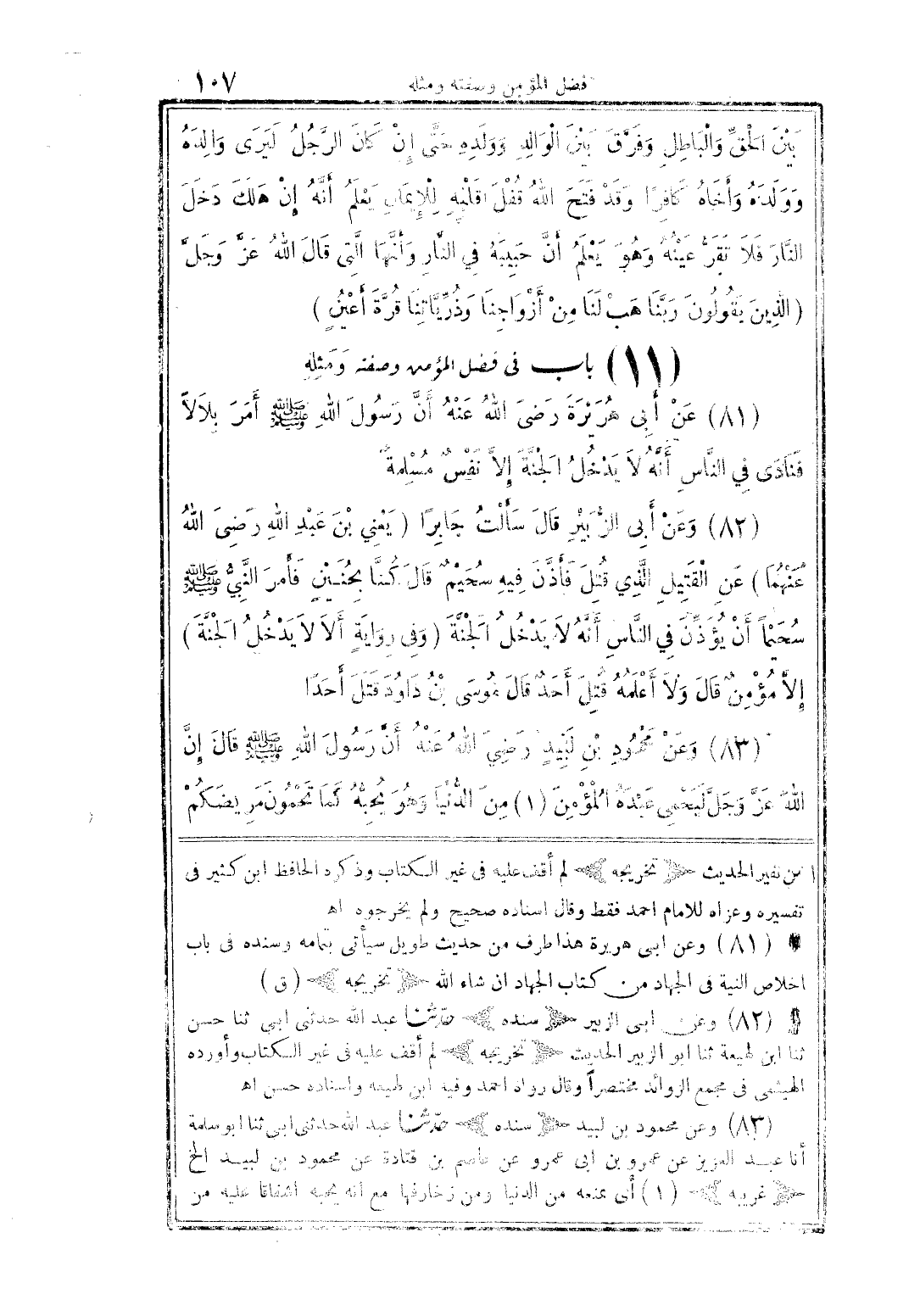(81) عن أبي هريرة رضي الله عنه أن رسول الله صلى الله عليه وسلم أمر بلالا فنادى في الناس أنه لا يدخل الجنة إلا نفس مسلمة