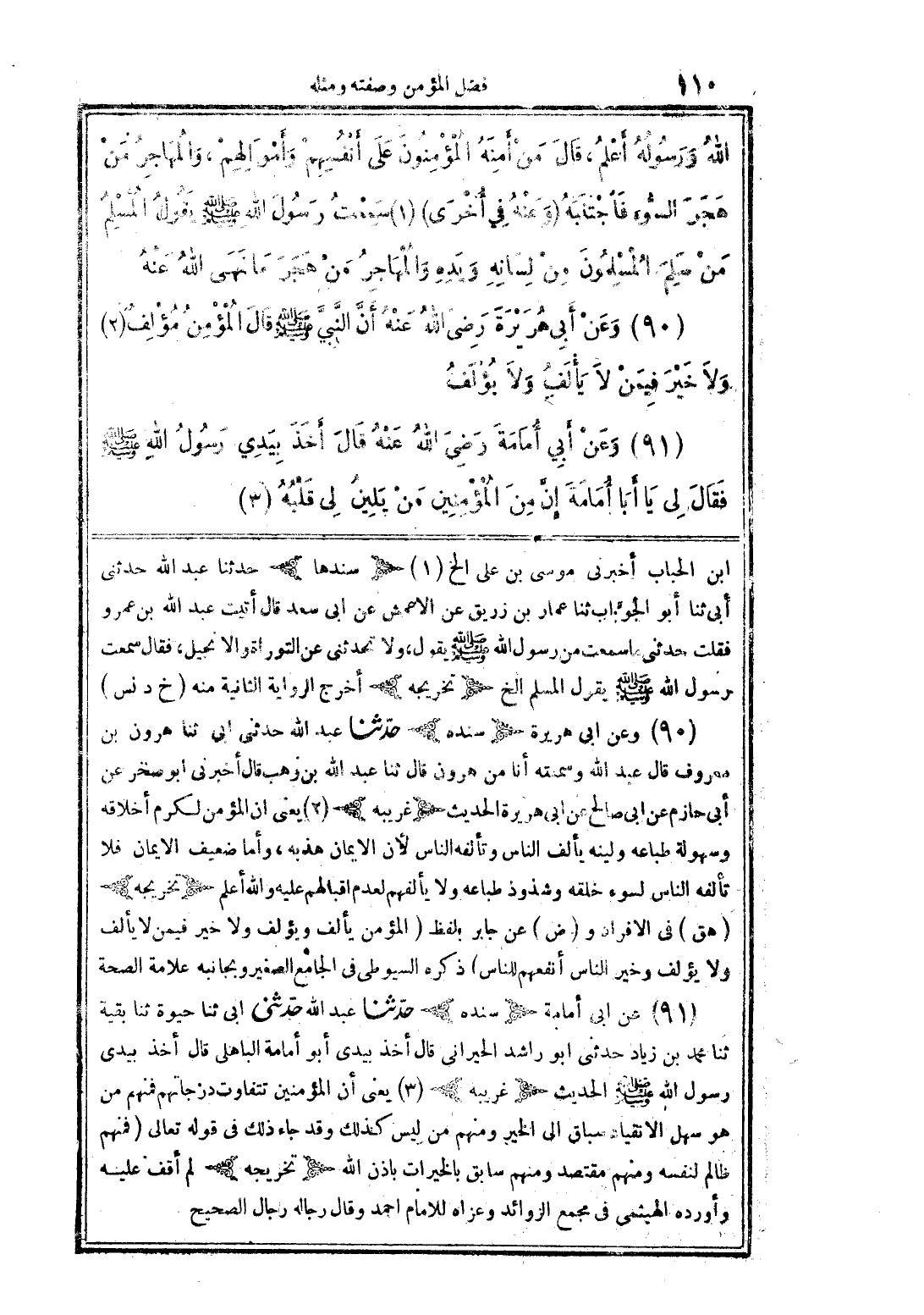 (91) عن أبي أمامة {سنده} حدثنا عبد الله حدثني أبي ثنا حيوة ثنا بقية ثنا محمد بن زياد حدثني أبو راشد الحيراني قال أخذ بيدي أبو أمامة الباهلي قال أخذ بيدي رسول الله صلى الله عليه وسلم الحديث {غريبه} ‹3› يعني أن المؤمنين تتفاوت درجاتهم فمنهم من هو سهل الانقياد سباق إلى الخير ومنهم من ليس كذلك وقد جاء ذلك في قوله تعالى فمنهم ظالم لنفسه ومنهم مقتصد ومنهم سابق بالخيرات بإذن الله {تخريجه} لم أقف عليه وأورده الهيثمي في مجمع الزوائد وعزاه للإمام أحمد وقال رجاله رجال الصحيح