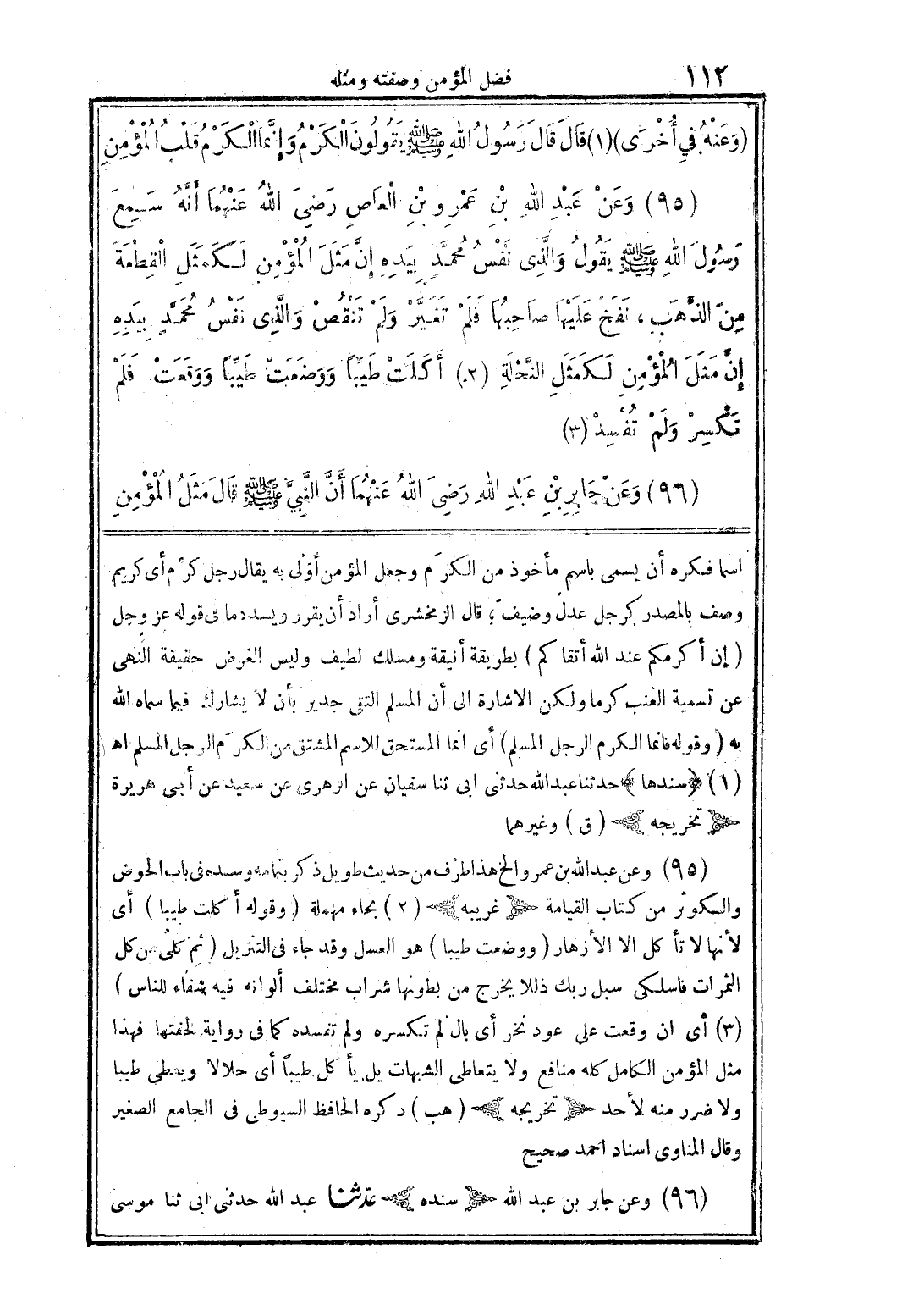 (95) وعن عبد الله بن عمرو بن العاص رضي الله عنهما أنه سمع رسول الله صلى الله عليه وسلم يقول والذي نفس محمد بيده إن مثل المؤمن لكمثل القطعة من الذهب، نفخ عليها صاحبها فلم تغير ولم تنقص والذي نفس محمد بيده إن مثل المؤمن لكمثل النحلة ‹2› أكلت طيبا ووضعت طيبا ووقعت فلم تكسر ولم تفسد ‹3›
