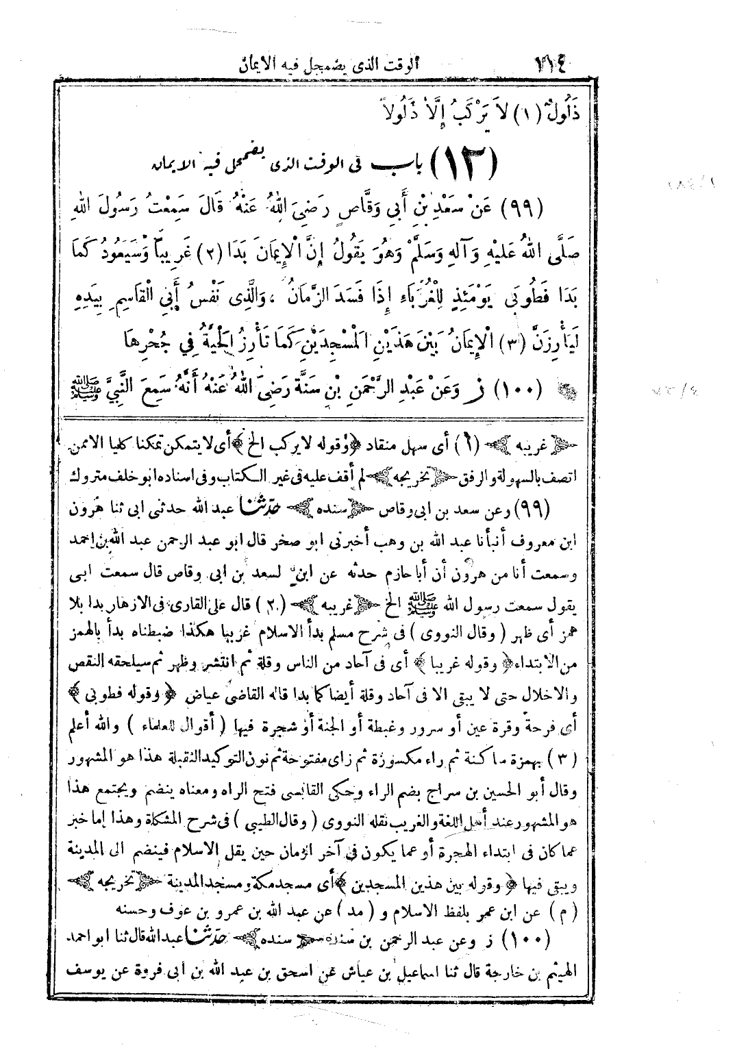 (99) عن سعد بن أبي وقاص رضي الله عنه قال سمعت رسول الله صلى الله عليه وآله وسلم وهو يقول إن الإيمان بدا ‹2› غريبا وسيعود كما بدا فطوبى يومئذ للغرباء إذا فسد الزمان، والذي نفس أبي القاسم بيده ليأرزن ‹3› الإيمان بين هذين المسجدين كما تأرز الحية في جحرها