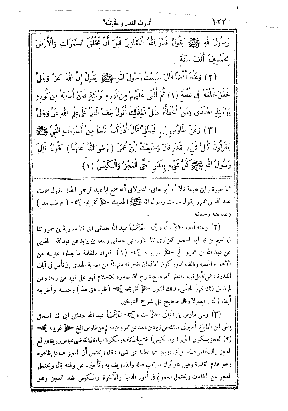 (3) وعن طاوس بن اليماني قال أدركت ناسا من أصحاب النبي صلى الله عليه وسلم يقولون كل شيء بقدر قال وسمعت ابن عمر (رضي الله عنهما) يقول قال رسول الله صلى الله عليه وسلم كل شيء بقدر حتى العجز والكيس ‹2›