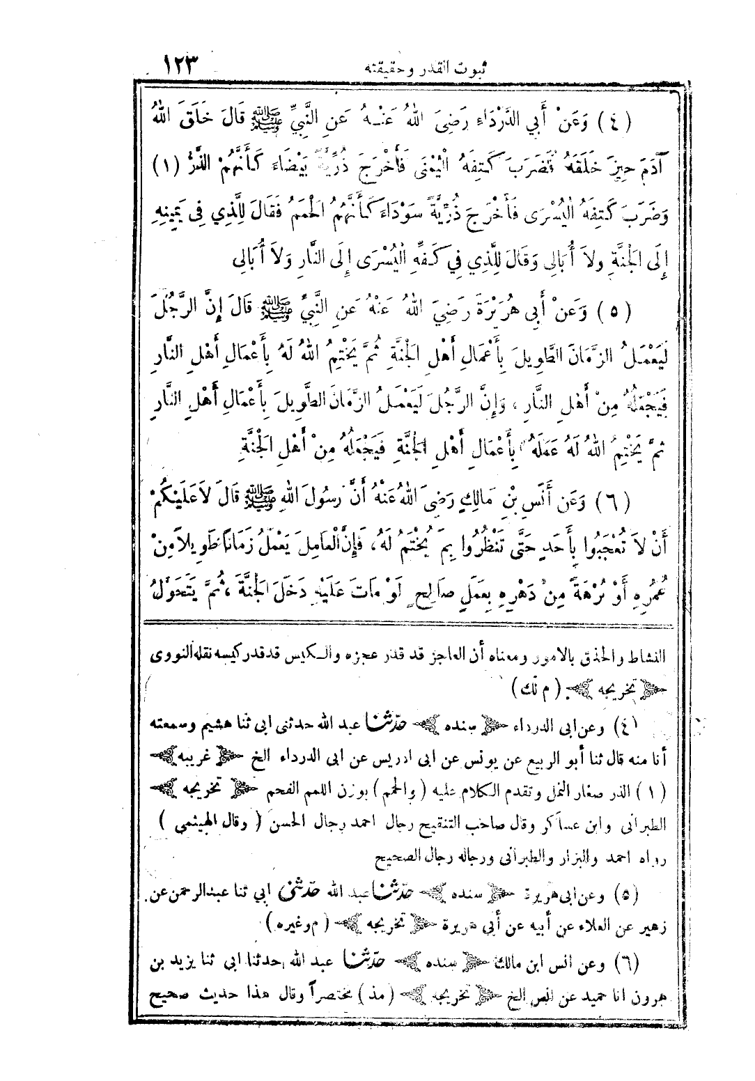 (4) وعن أبي الدرداء رضي الله عنه عن النبي صلى الله عليه وسلم قال خلق الله آدم حين خلقه فضرب كتفه اليمنى فأخرج ذرية بيضاء كأنهم الذر ‹1› وضرب كتفه اليسرى فأخرج ذرية سوداء كأنهم الحمم فقال للذي في يمينه إلى الجنة ولا أبالي وقال للذي في كفه اليسرى إلى النار ولا أبالي