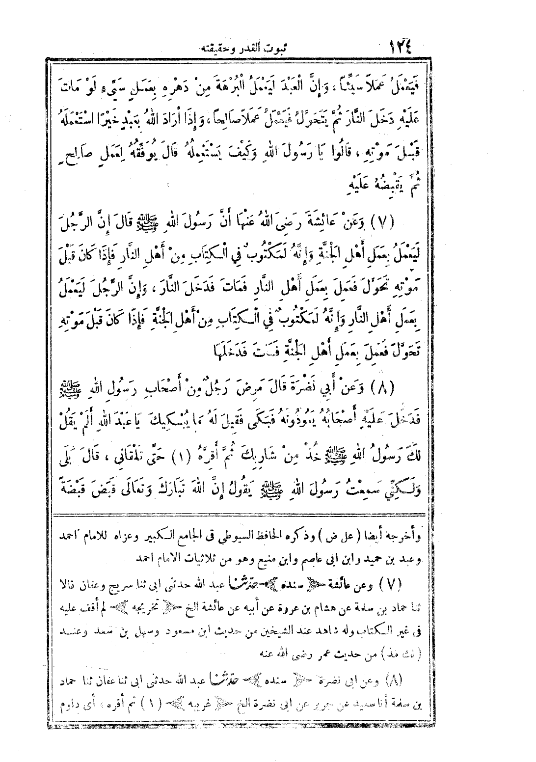 (7) وعن عائشة رضي الله عنها أن رسول الله صلى الله عليه وسلم قال إن الرجل ليعمل بعمل أهل الجنة وإنه لمكتوب في الكتاب من أهل النار فإذا كان قبل موته تحول فعمل بعمل أهل النار فمات فدخل النار، وإن الرجل ليعمل بعمل أهل النار وإنه لمكتوب في الكتاب من أهل الجنة فإذا كان قبل موته تحول فعمل بعمل أهل الجنة فمات فدخلها