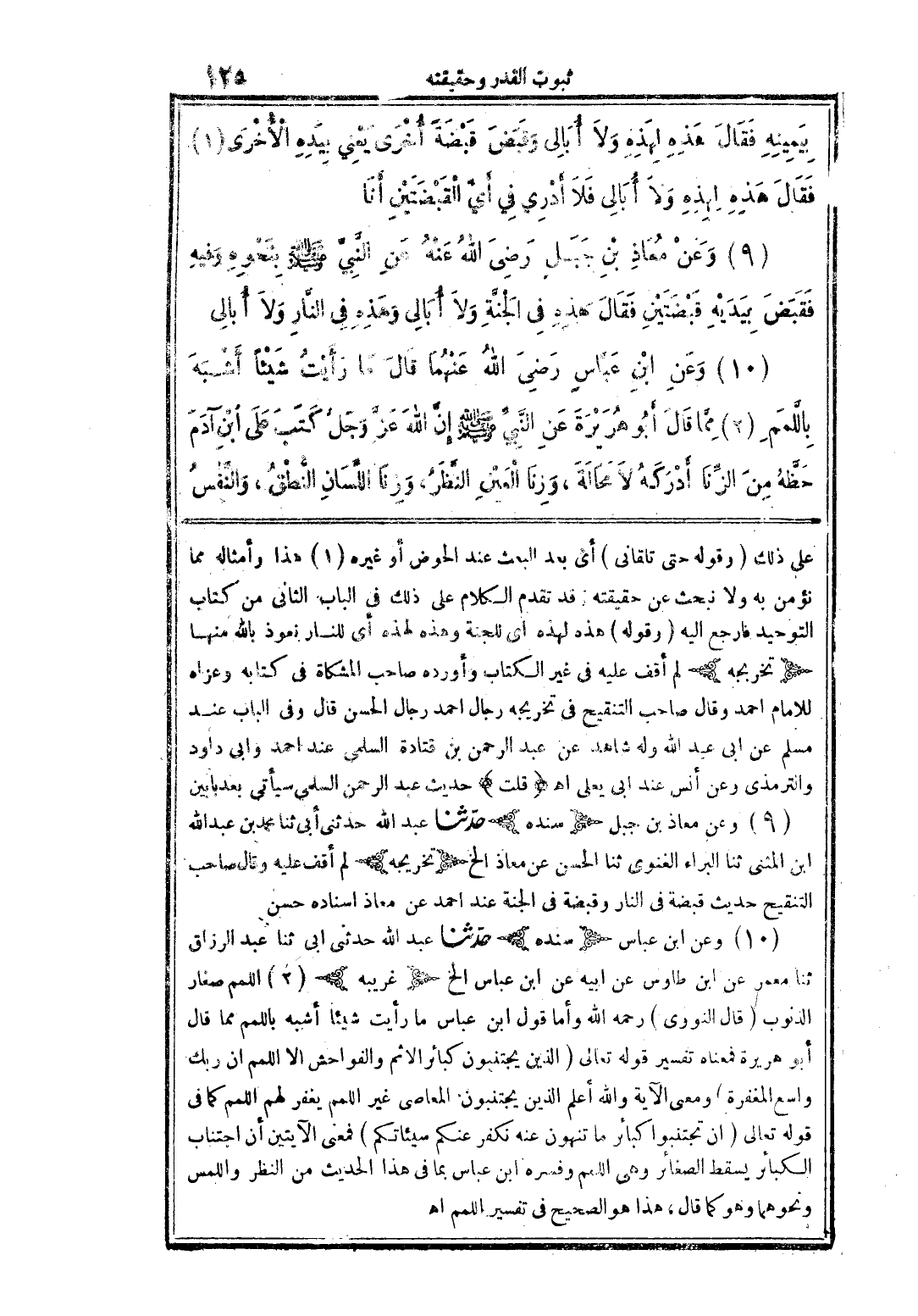 (10) وعن ابن عباس رضي الله عنهما قال ما رأيت شيئا أشبه باللمم ‹2› مما قال أبو هريرة عن النبي صلى الله عليه وسلم إن الله عز وجل كتب على ابن آدم حظه من الزنا أدركه لا محالة، وزنا العين النظر، وزنا اللسان النطق، والنفس