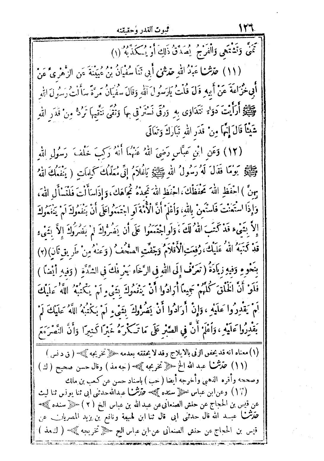(12) وعن ابن عباس رضي الله عنهما أنه ركب خلف رسول الله صلى الله عليه وسلم يوما فقال له رسول الله صلى الله عليه وسلم يوما يا غلام إني معلمك كلمات (ينفعك الله بهن) احفظ الله يحفظك، احفظ الله تجده تجاهك، إذا سألت فلتسأل الله وإذا استعنت فاستعن بالله واعلم أن الأمة لو اجتمعوا على أن ينفعوك لم ينفعوك إلا بشيء قد كتبه الله عليك، رفعت الأقلام وجفت الصحف (وعنه من طريق ثان) ‹2› بنحوه وفيه زيادة (تعرف إلى الله في الرخاء يعرفك في الشدة (وفيه أيضا) فلو أن الخلق كلهم جميعا أرادوا أن ينفعوك بشيء لم يكتبه الله عليك لم يقدروا عليه، واعلم أن في الصبر على ما تكره خيرا كثيرا وأن النصر مع