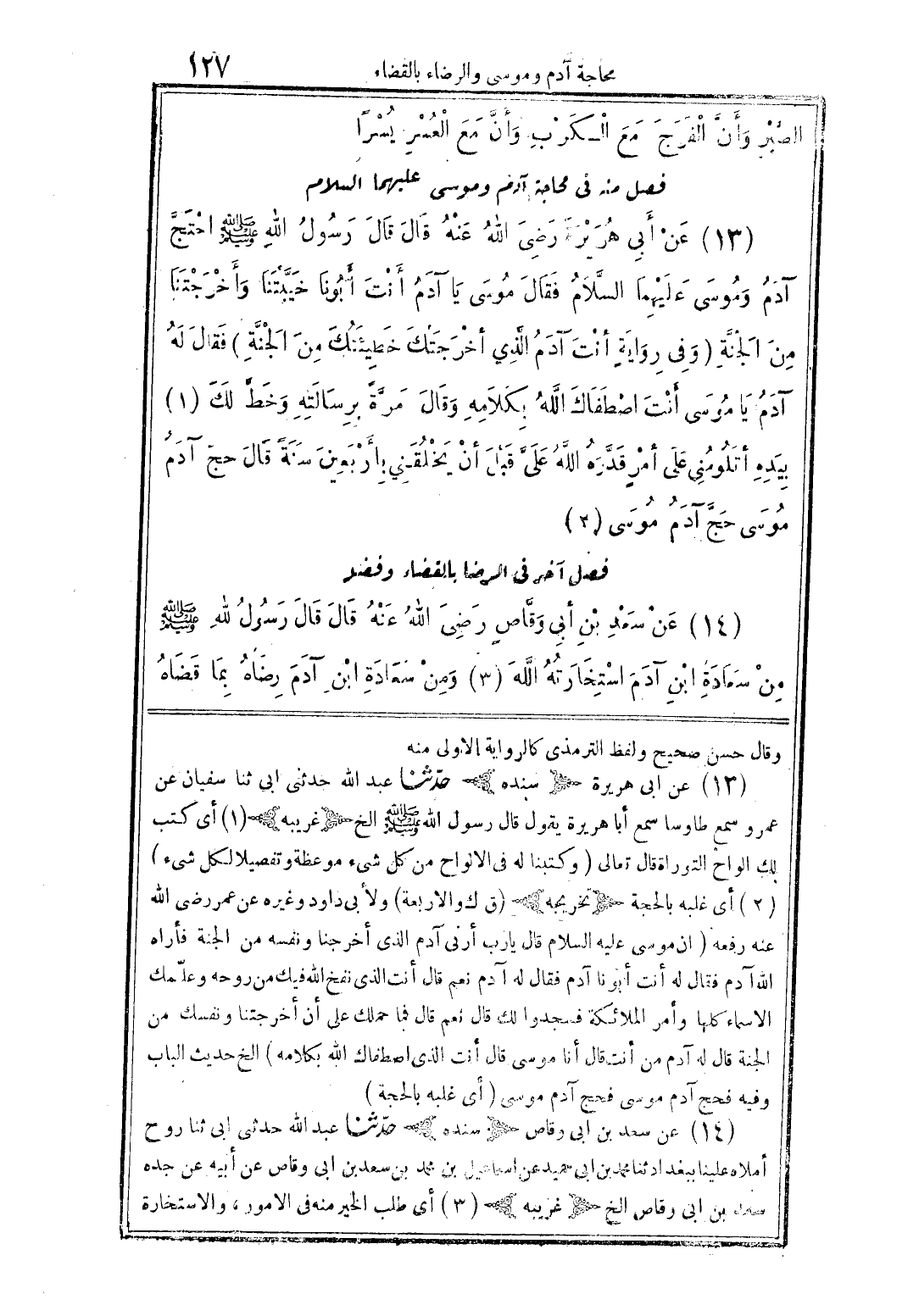 (13) عن أبي هريرة رضي الله عنه قال قال رسول الله صلى الله عليه وسلم احتج آدم وموسى عليهما السلام فقال موسى يا آدم أنت أبونا خيبتنا وأخرجتنا من الجنة (وفي رواية أنت آدم الذي أخرجتك خطيئتك من الجنة) فقال له آدم يا موسى أنت اصطفاك الله بكلامه وقال مرة برسالته وخط لك ‹1› بيده أتلومني على أمر قدره الله علي قبل أن يخلقني بأربعين سنة قال حج آدم موسى حج آدم موسى ‹2›