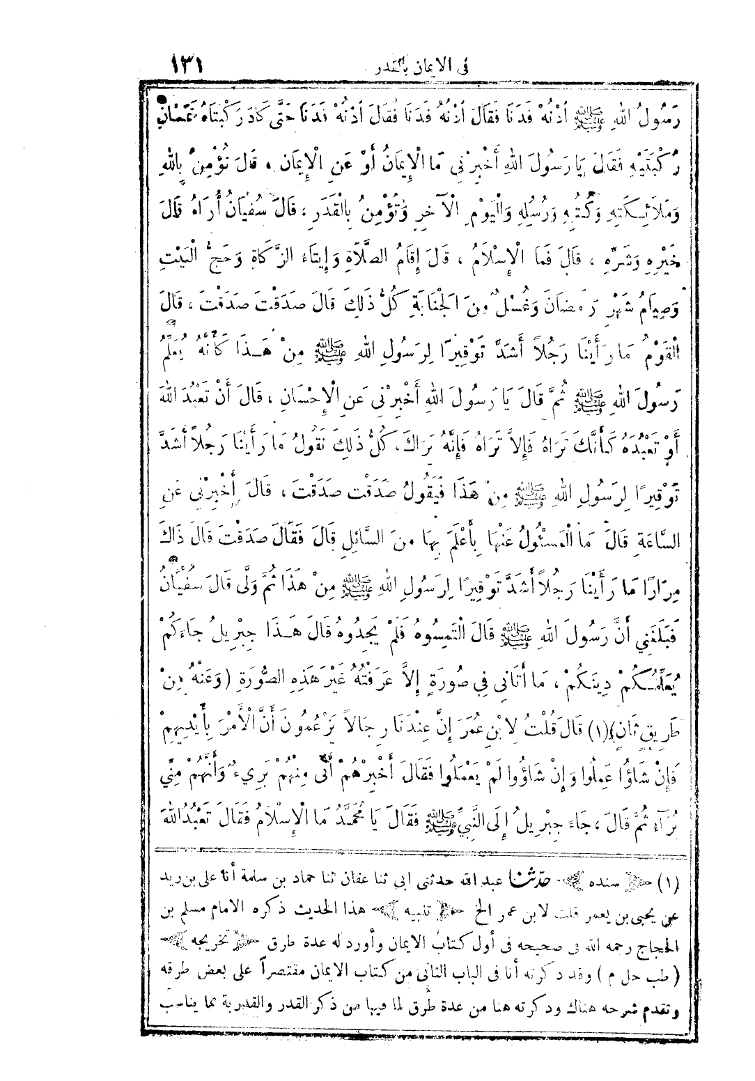 ‹1› {سنده} حدثنا عبد الله حدثني أبي ثنا عفان ثنا حماد بن سلمة أنا علي بن يزيد عن يحيى بن يعمر قلت لابن عمر الخ {تنبيه} هذا الحديث ذكره الإمام مسلم بن الحجاج رحمه الله في صحيحه في أول كتاب الإيمان وأورد له عدة طرق {تخريجه} (طب حل م) وقد ذكرته أنا في الباب الثاني من كتاب الإيمان مقتصرا على بعض طرقه وتقدم شرحه هناك وذكرته هنا من عدة طرق لما فيه من ذكر القدر والقدرية مما يناسب