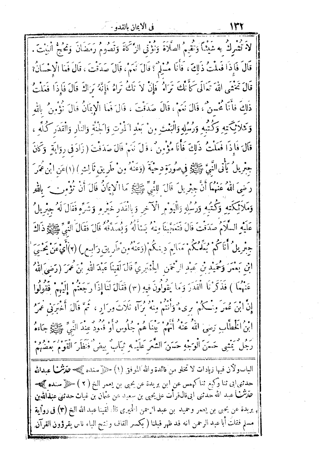 لا تشرك بالله شيئا وتقيم الصلاة وتؤتي الزكاة وتصوم رمضان وتحج البيت قال فإذا فعلت ذلك، فأنا مسلم؟ قال نعم، قال صدقت قال فما الإحسان؟ قال تخشى الله تعالى كأنك تراه فإن لا تك تراه فإنه يراك قال فإذا فعلت ذلك فأنا محسن، قال نعم قال صدقت، قال فما الإيمان قال تؤمن بالله وملائكته وكتبه ورسله والبعث من بعد الموت والجنة والنار والقدر كله، قال فإذا فعلت ذلك فأنا مؤمن قال نعم قال صدقت (زاد في رواية وكان جبريل يأتي النبي صلى الله عليه وسلم في صورة دحية (وعنه من طريق ثالث) ‹1› عن ابن عمر رضي الله عنهما أن جبريل قال للنبي صلى الله عليه وسلم ما الإيمان قال أن تؤمن بالله وملائكته وكتبه ورسله واليوم الآخر وبالقدر خيره وشره فقال له جبريل عليه السلام صدقت قال فتعجبنا منه يسأله ويصدقه قال فقال النبي صلى الله عليه وسلم ذاك جبريل أتاكم يعلمكم معالم دينكم (وعنه من طريق رابع) ‹2› أي عن يحيى بن يعمر وحميد بن عبد الرحمن الحميري قال لقينا عبد الله بن عمر رضي الله عنهما فذكرنا القدر وما يقولون فيه ‹3› فقال لنا إذا رجعتم إليهم فقولوا إن ابن عمر منكم بريء وأنتم منه برآء ثلاث مرار ثم قال أخبرني عمر بن الخطاب رضي الله عنه أنهم بينا هم جلوس أو قعود عند النبي صلى الله عليه وسلم جاءه رجل يمشي حسن الوجه حسن الشعر عليه ثياب بيض فنظر القوم بعضهم