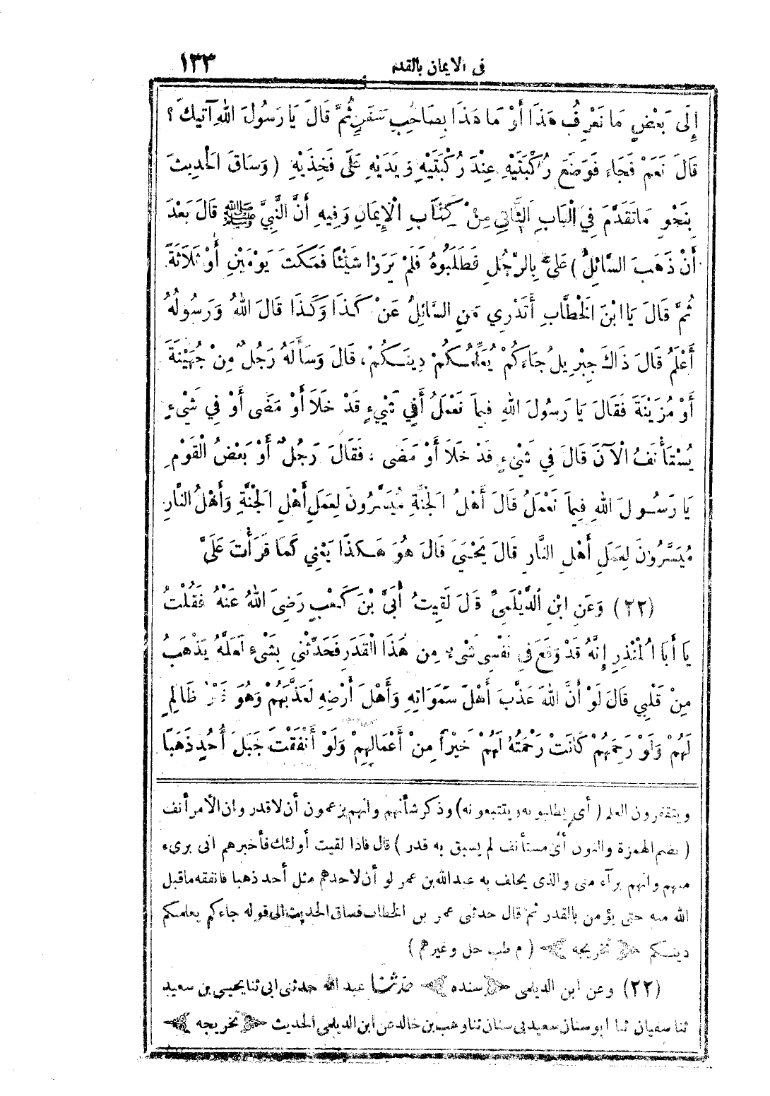 ويتقفرون العلم (أي يطلبونه ويتتبعونه) وذكر شأنهم وأنهم يزعمون أن لا قدر وأن الأمر أنف (بضم الهمزة والنون أي مستأنف لم يسبق به قدر) قال فإذا لقيت أولئك فأخبرهم أني بريء منهم وأنهم برآء مني والذي يحلف به عبد الله بن عمر لو أن لأحدهم مثل أحد ذهبا فأنفقه ما قبل الله منه حتى يؤمن بالقدر ثم قال حدثني عمر بن الخطاب فساق الحديث إلى قوله جاءكم يعلمكم دينكم {تخريجه} (م طب حل وغيرهم)