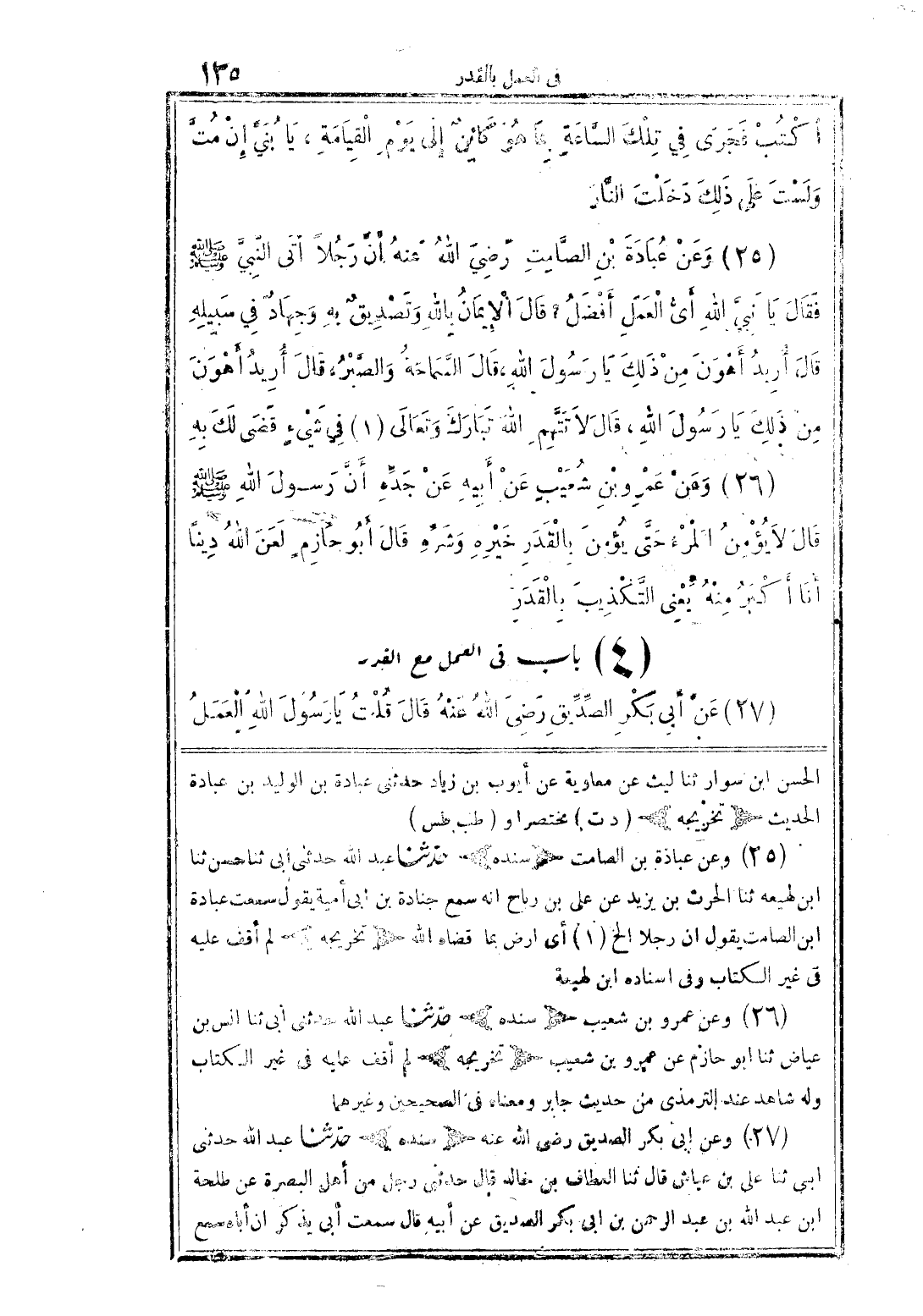 (26) وعن عمرو بن شعيب عن أبيه عن جده أن رسول الله صلى الله عليه وسلم قال لا يؤمن المرء حتى يؤمن بالقدر خيره وشره قال أبو حازم لعن الله دينا أنا أكبر منه يعني التكذيب بالقدر