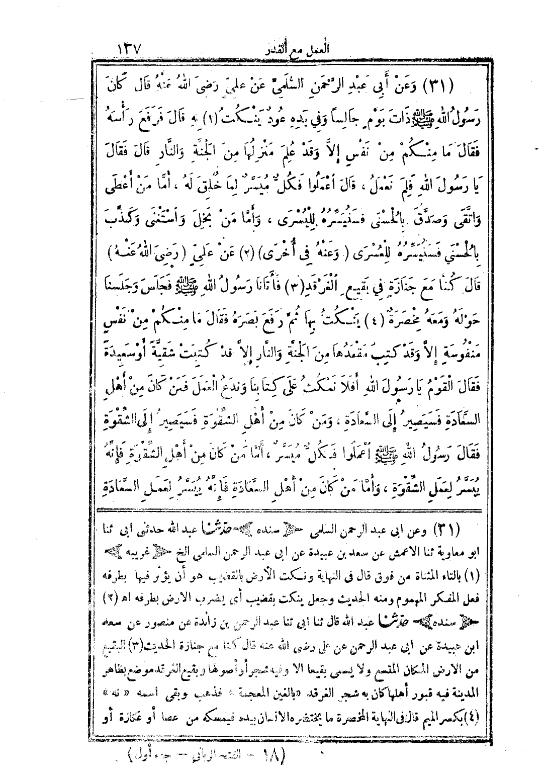 (31) وعن أبي عبد الرحمن السلمي عن علي رضي الله عنه قال كان رسول الله صلى الله عليه وسلم ذات يوم جالسا وفي يده عود ينكت ‹1› به قال فرفع رأسه فقال ما منكم من نفس إلا وقد علم منزلها من الجنة والنار قال فقال يا رسول الله فلم نعمل، قال اعملوا فكل ميسر لما خلق له، أما من أعطى واتقى وصدق بالحسنى فسنيسره لليسرى، وأما من بخل واستغنى وكذب بالحسنى فسنيسره للعسرى (وعنه في أخرى) ‹2› عن علي (رضي الله عنه) قال كنا مع جنازة في بقيع الغرقد ‹3› فأتانا رسول الله صلى الله عليه وسلم فجلس وجلسنا حوله ومعه مخصرة ‹4› ينكت بها ثم رفع بصره فقال ما منكم من نفس منفوسة إلا وقد كتب مقعدها من الجنة والنار إلا قد كتبت شقية أو سعيدة فقال القوم يا رسول الله أفلا نمكث على كتابنا وندع العمل فمن كان من أهل السعادة فسيصير إلى السعادة، ومن كان من أهل الشقوة فسيصير إلى الشقوة فقال رسول الله صلى الله عليه وسلم اعملوا فكل ميسر، أما من كان من أهل الشقوة فإنه ييسر لعمل الشقوة، وأما من كان من أهل السعادة فإنه ييسر لعمل السعادة