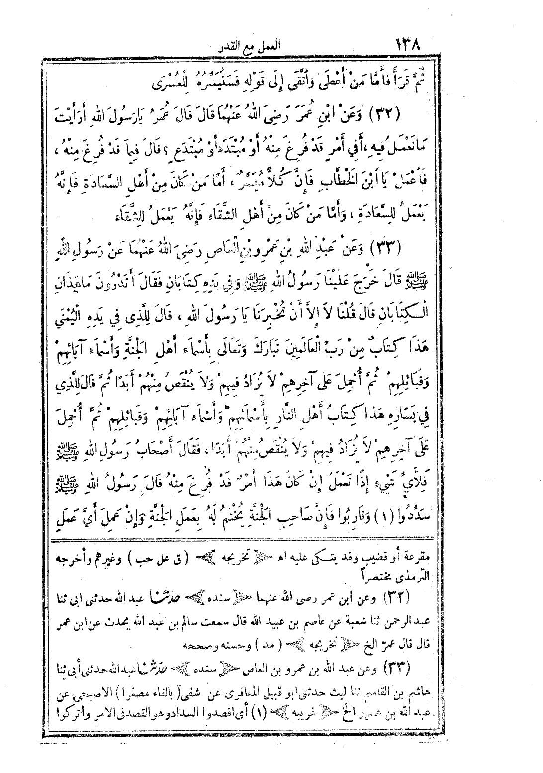 (32) وعن ابن عمر رضي الله عنهما قال قال عمر يا رسول الله أرأيت ما نعمل فيه، أفي أمر قد فرغ منه أو مبتدأ أو مبتدع؟ قال فيما قد فرغ منه فاعمل يا ابن الخطاب فإن كلا ميسر، أما من كان من أهل السعادة فإنه يعمل للسعادة وأما من كان من أهل الشقاء فإنه يعمل للشقاء