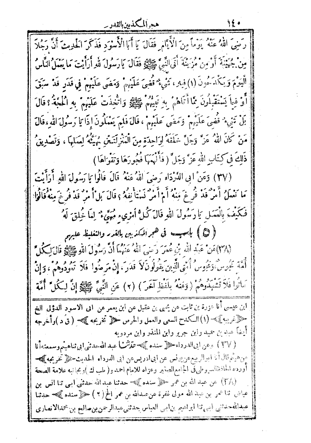 (37) وعن أبي الدرداء رضي الله عنه قال قالوا يا رسول الله أرأيت ما نعمل أمر قد فرغ منه أم أمر نستأنفه؟ قال بل أمر قد فرغ منه قالوا فكيف بالعمل يا رسول الله قال كل امرئ مهيء لما خلق له