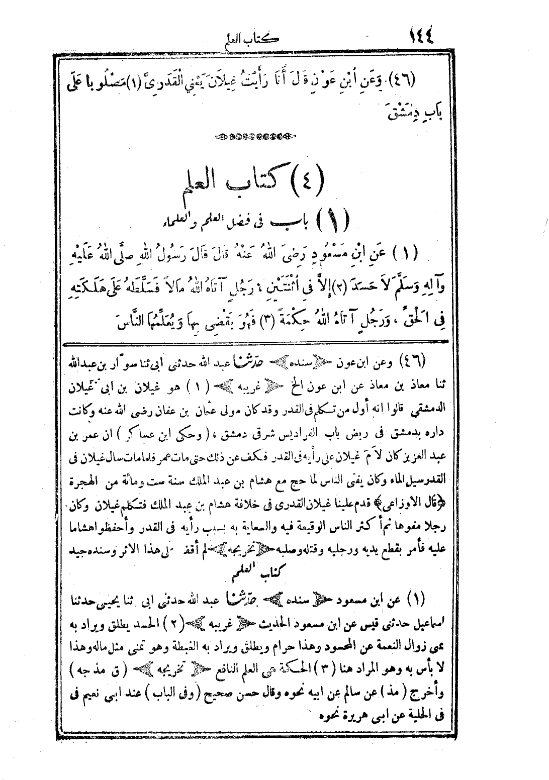 (1) عن ابن مسعود رضي الله عنه قال قال رسول الله صلى الله عليه وآله وسلم لا حسد ‹2› إلا في اثنتين، رجل آتاه الله مالا فسلطه على هلكته في الحق ورجل آتاه الله حكمة ‹3› فهو يقضي بها ويعلمها الناس