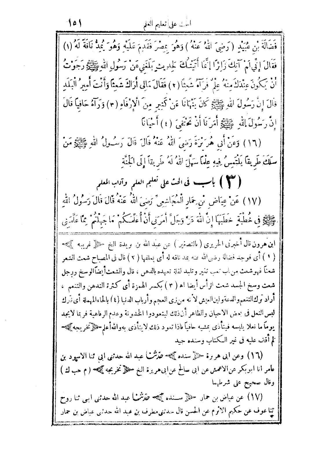 (16) وعن أبى هريرة رضى الله عنه قال قال رسول الله صلى الله عليه وسلم من سلك طريقاً يلتمس فيه علما سهل الله له طريقا الى الجنة